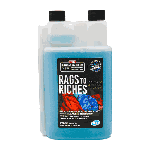 P&S Double Black Rags to Riches is the microfiber detergent you have been waiting for to restore your microfibers natural look and feel. The formula used in P&S Double Black Rags to Riches deep cleans while also restoring absorbency and color to your microfiber towels. Even when they have been used with professional detailing products. P&S Double Black Rags to Riches will also brighten and soften the quality, bringing back to life its original beauty.